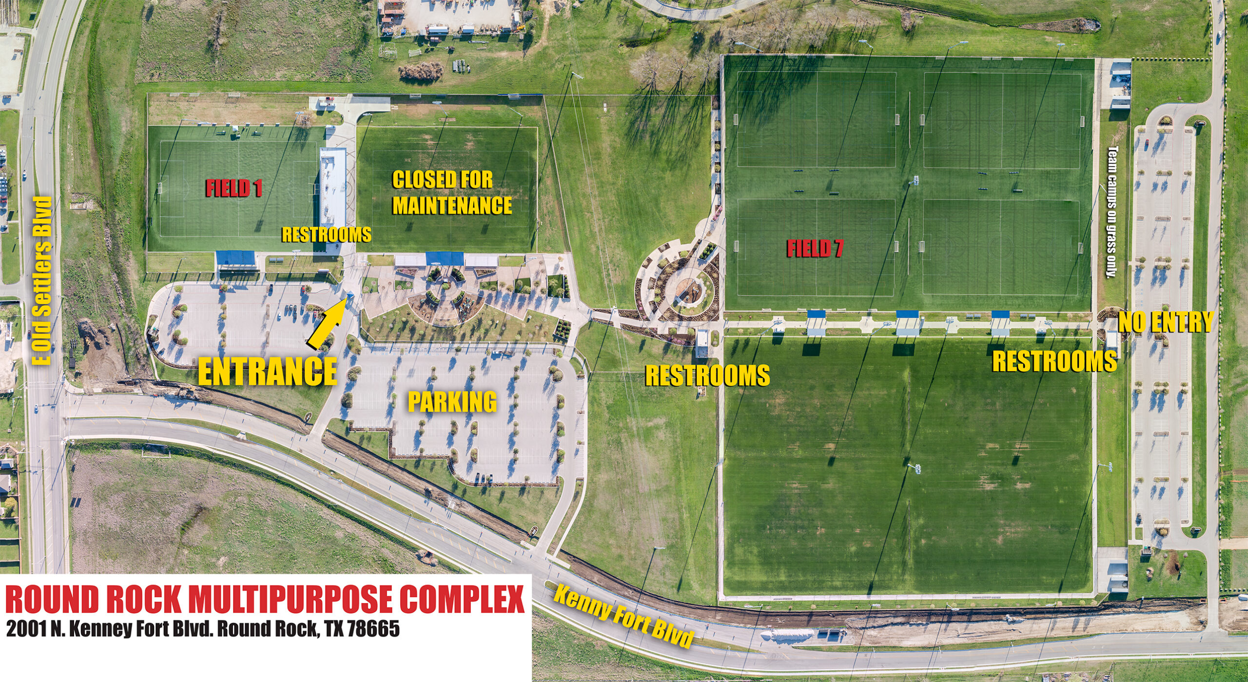All team areas should be in the grassy areas surrounding the four fields. Outside food and drinks are allowed in the team areas.